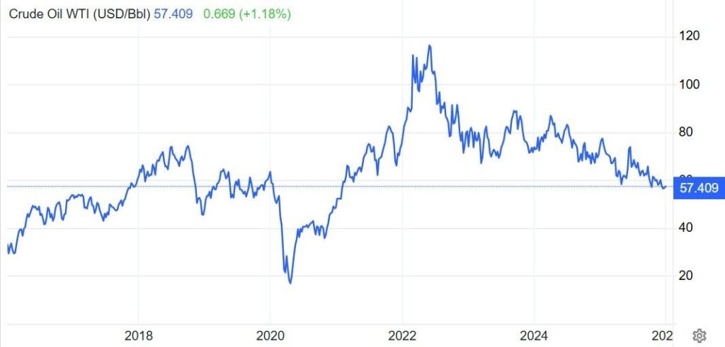 在從疫情時期低點16.62美元/桶一路飆升至2022年高點113.48美元/桶、累計上漲582.79%之後,截至2026年1月1日,「黑金」價格已回撤49.41%,目前位於57.41美元/桶水平。