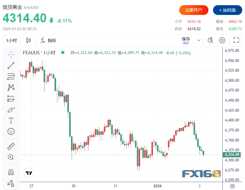 美市盤中,現貨黃金小幅下跌0.11%,報4314.40美元/盎司,較日內稍早觸及的4402.19美元/盎司高點持續回落。此前金價在12月26日觸及歷史新高4549.71美元/盎司,並在本週三一度跌至兩週低點。
