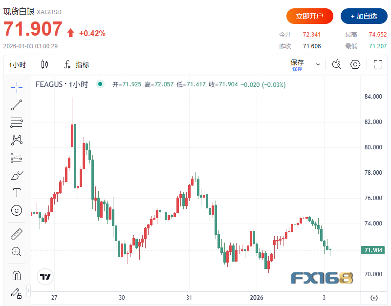 FX168財經報社(北美)訊 2026年首個交易日(週五),貴金屬市場一度強勢反彈,但隨後持續自高位回落。在金價轉跌之際,白銀、鉑金和鈀金仍維持漲勢。市場人士指出,驅動資金迴流的核心因素來自兩條主線:一是主要大國關係緊張與中東局勢升溫推高避險需求;二是投資者對美聯儲今年至少兩次降息的預期升溫,壓低實際利率,從而強化無息資產的配置吸引力。與此同時,美國總統特朗普就伊朗國內抗議局勢發表強硬表態,也令地緣風險溢價在新年伊始迅速擡升。