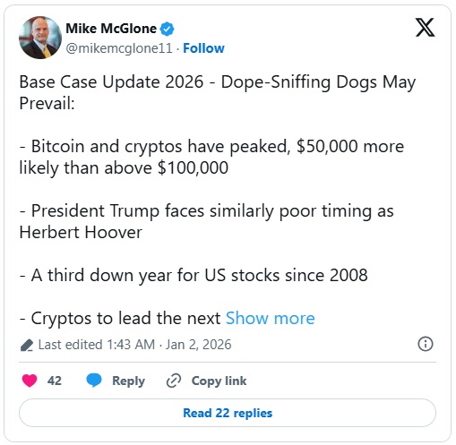 與金融界其他一些知名人士——尤其是羅伯特·清崎(Robert Kiyosaki)——的觀點相呼應,麥格隆在1月1日表示,2026年將是一個充滿波動與危機的年份,但同時也蘊藏機會;對那些「擅長戰術操作」的人來說,甚至可能賺到一大筆錢。