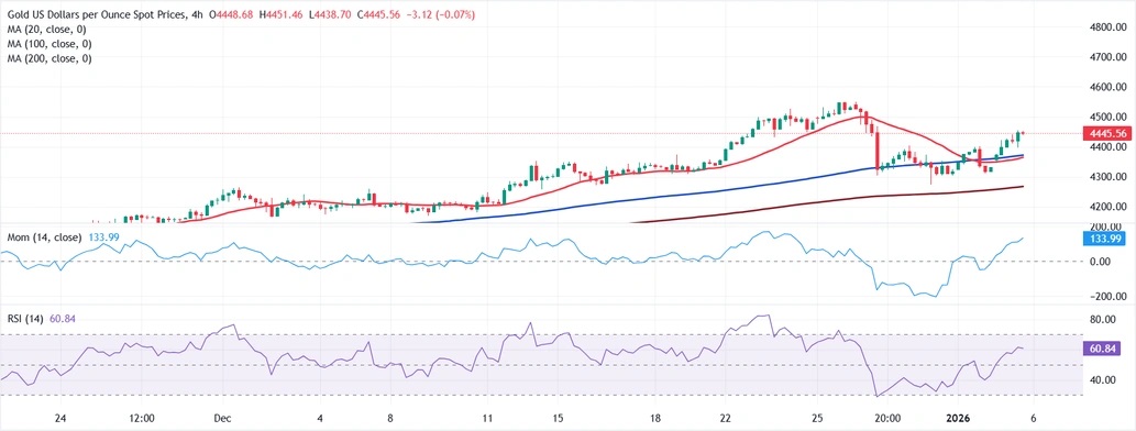 24K99訊 週二(1月6日)亞市盤中,現貨黃金在昨日驚人暴漲後維持升勢,目前金價位於4460美元/盎司附近。FXStreet首席分析師Valeria Bednarik撰文,對黃金技術前景進行分析。