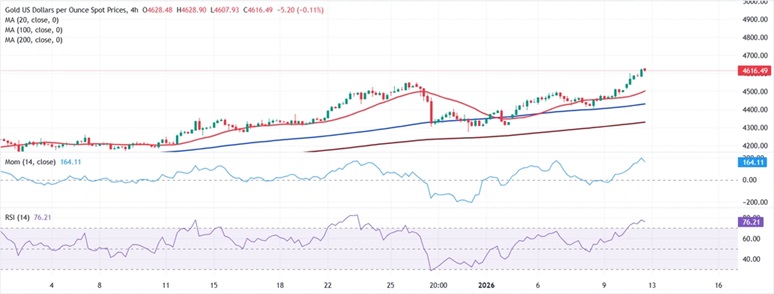Bednarik指出,4小時圖顯示,黃金已嚴重超買,但溫和的回調錶明買家仍願意推高價格。20週期簡單移動平均線(SMA)位於100週期和200週期SMA之上,且三條均線均向上傾斜,凸顯強勁的看漲傾向,其中20週期SMA位於4502.36美元/盎司,提供強勁的支撐。與此同時,動量指標已從極高水平回落,相對強弱指數(RSI)爲76,也失去上漲動能。100週期SMA位於4430.87美元/盎司附近,可緩衝更大幅度的回調。