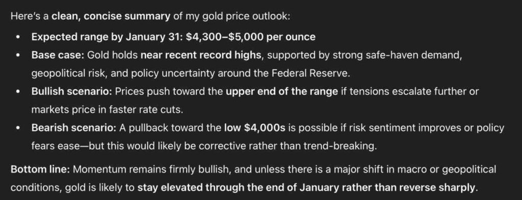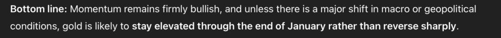 不過,ChatGPT指出,潛在的回調更可能意味着進入修正階段,而非打破整體上行趨勢。換言之,它認爲前景仍然「堅定看漲」,金價在整個1月期間很可能會「維持在高位」。