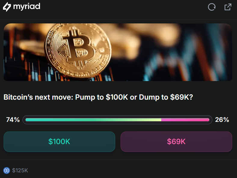 在由Decrypt母公司Dastan推出的預測市場Myriad上,交易者正在快速重新定價:關於「比特幣會先拉昇至10萬美元、再下跌至6.9萬美元」的概率,目前爲72.5%,較昨天的85%顯著回落。與此同時,押注「Solana在7月前再創歷史新高」的資金中,90%選擇了「不」。