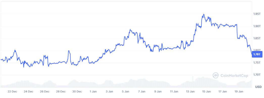 在美國與歐洲之間外交與貿易緊張局勢升級的推動下,市場不確定性持續上升,風險資產面臨不利環境。這一變化削弱了市場對高風險投資的偏好,並直接衝擊了加密市場——比特幣仍被普遍視爲風險資產。結果是,部分資金轉向更穩健的資產,抑制了BTC的短期需求。從比特幣市值觀察,其已從1月14日接近2萬億美元的水平,回落至約1.78萬億美元。該變化反映出顯著的資金外流,解釋了近期BTC價格的快速下跌,以及過去幾個交易日加密市場市值蒸發數十億美元的現象。