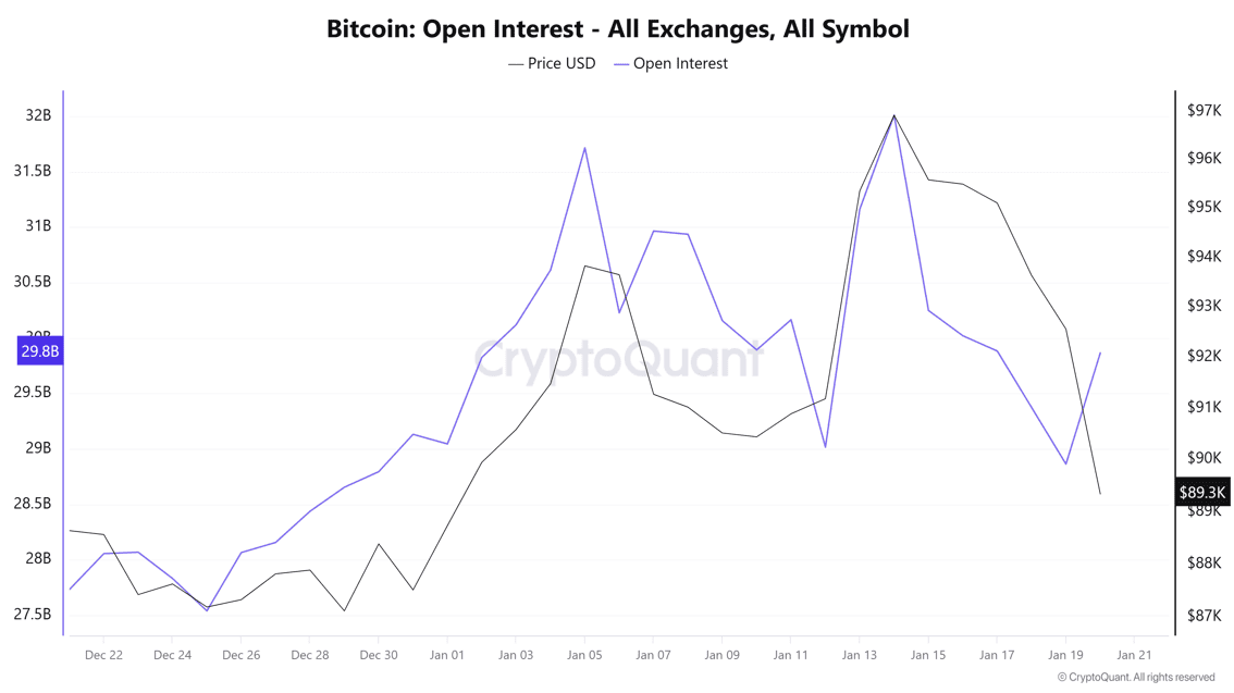 與此同時,未平倉合約(Open Interest)指標回升至約298億美元附近,時間點與比特幣近期跌破每枚9萬美元相吻合。需要注意的是,未平倉合約衡量的是機構市場中多頭與空頭未平倉倉位的總量。在本例中,未平倉合約上升而價格下跌,意味着空頭倉位顯著增加,指向機構參與者短期信心下滑。