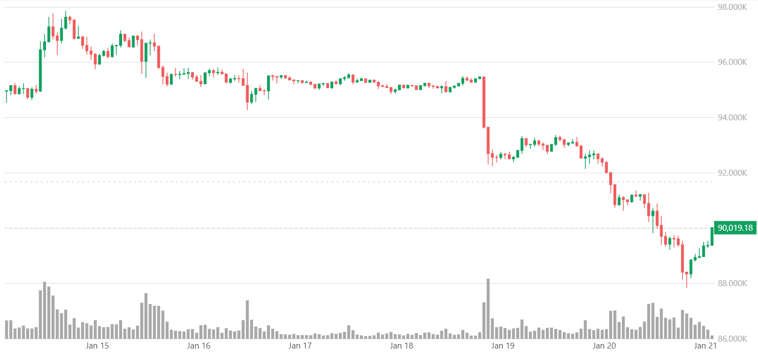 FX168財經報社(亞太)訊 在全球金融市場出現大幅拋售、投資者在持續的地緣政治緊張局勢下繼續降低風險敞口之際,加密市場又在「失血」。週三(1月21日)比特幣已跌破9萬美元,跌至逾一週以來的最低水平。