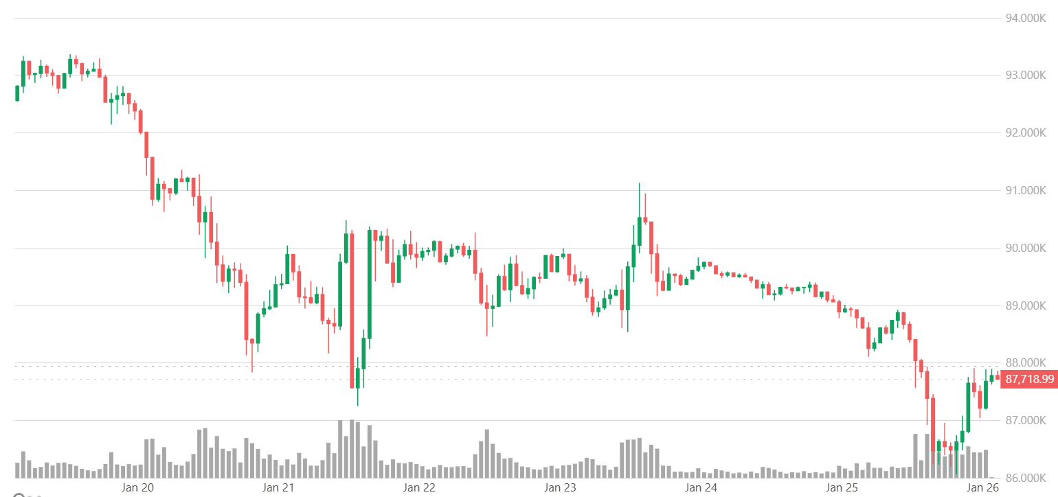 FX168財經報社(亞太)訊 在週末重挫後,週一(1月26日)比特幣繼續在8.7萬美元附近低位盤整,以太坊也承壓下滑,美國威脅對加拿大徵稅以及美國政府停擺風險壓制風險情緒,值此之際,避險資金涌入黃金推動價格史上首次突破5000美元。本週來看,除繼續關注地緣政治風險外,市場需警惕美聯儲決議以及科技股財報。