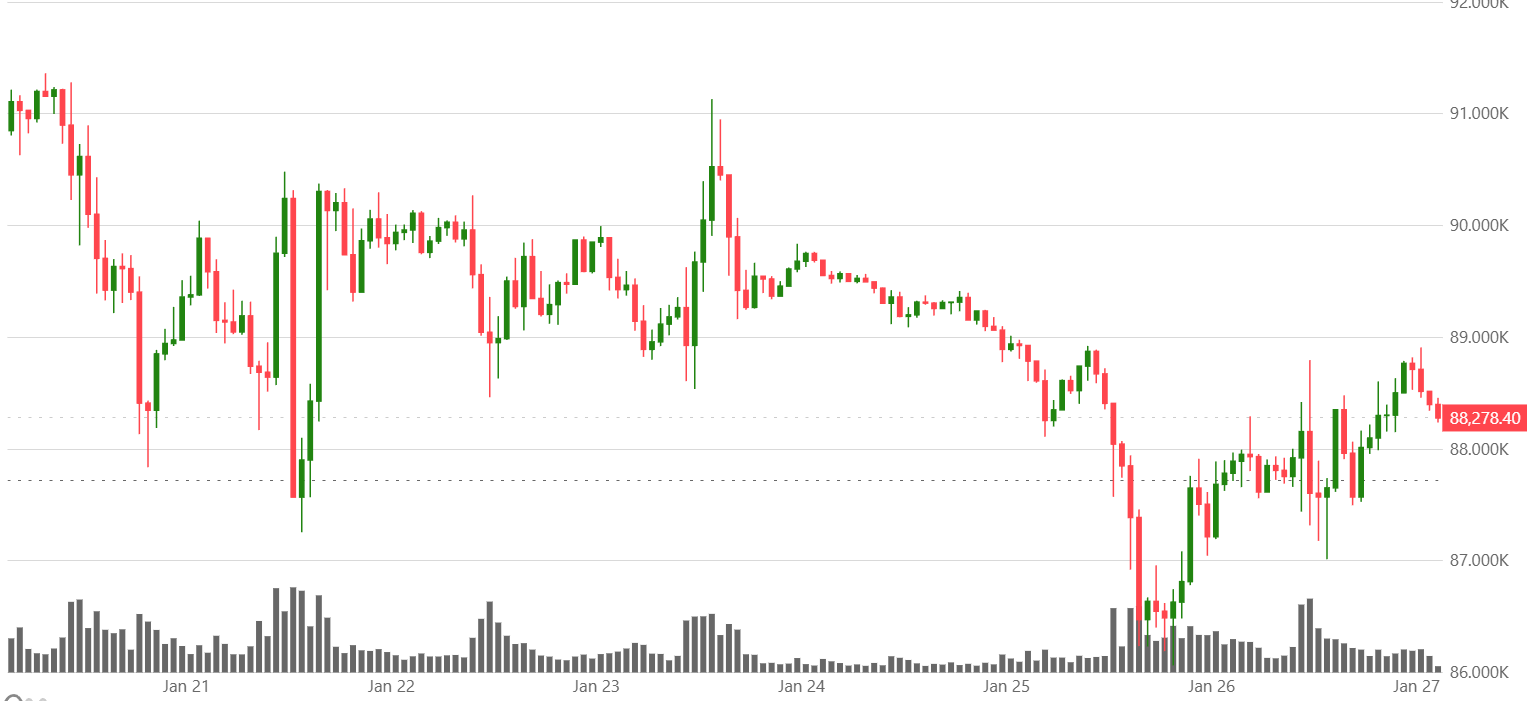 FX168財經報社(亞太)訊 週二(1月27日)比特幣在昨日強勢反彈後試圖盤整,目前仍在8.8萬美元附近「橫盤僵持」,以太坊交投在3000美元略下方,與此同時,黃金與白銀延續強勁漲勢後出現回吐。比特幣較週末一度出現的恐慌性拋售有所反彈,但較上週五晚間接近9萬美元的水平回落。