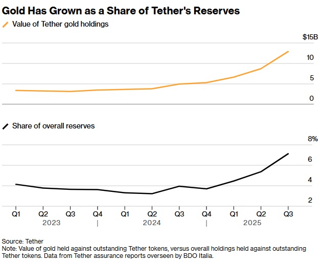 根據彭博社的計算,Tether在去年迅速加大黃金購買力度,購買了超過70噸黃金用於其儲備以及自身的黃金穩定幣。這一數字超過了幾乎所有單一央行的購買量:只有波蘭,增加了102噸黃金儲備,做出了更大的公開購買。此外,這一數字也超過除前三大交易所交易基金(ETF)外的所有購買量,這些基金代表了成千上萬的個人交易者和投資者的集體活動。