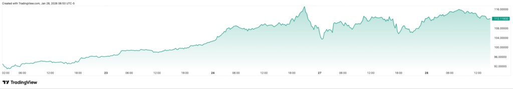 週四(1月29日)亞市盤中,現貨白銀價格一度上漲2.3%,創下119.40美元/盎司的歷史新高,連續第六個交易日走高。