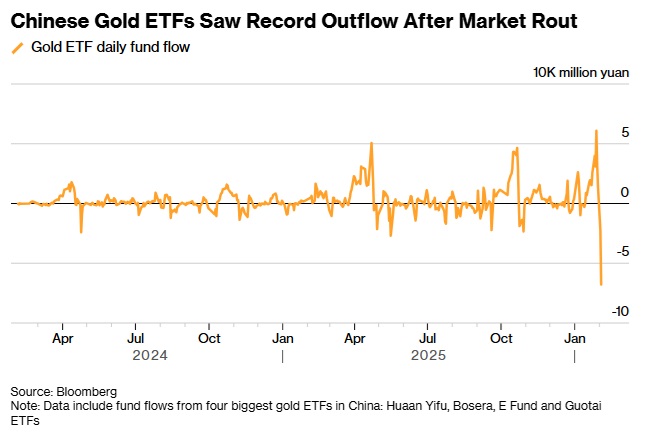 24K99訊 美國彭博社週三(2月4日)報道稱,中國主要的黃金支持型交易所交易基金(ETFs)錄得歷史上最大單日資金流出——總計接近10億美元——投資者信心受到金屬價格從歷史最高點急劇回落的影響。