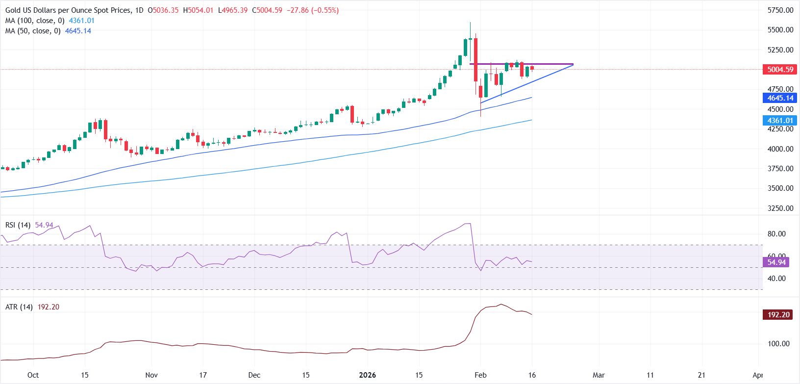 從技術角度看,日線圖顯示出一個上升三角形形態,5050-5100美元區域限制了反彈嘗試。50日簡單移動平均線(SMA)仍高於100日SMA,強化了整體看漲結構。
