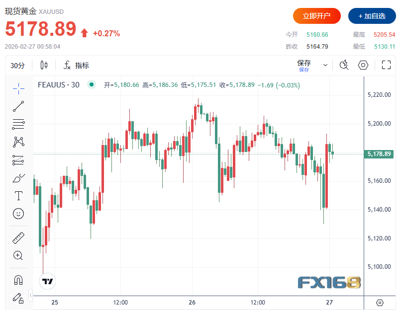 FX168財經報社(北美)訊 週四(2月26日),國際金價整體持穩,市場在中東地緣局勢與美國貿易政策不確定性之間權衡,投資者普遍選擇在美伊第三輪間接核談判結果出爐前暫時觀望,以評估潛在協議是否可能緩和地緣風險並削弱避險需求。