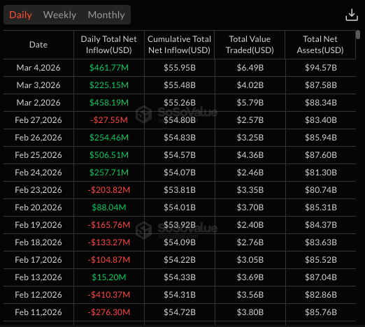 Balchunas表示,比特幣現貨ETF再度迎來強勁資金流入,「又是接近5億美元流入的一天」。在11只比特幣ETF中,有10只當日獲得資金淨流入。數據顯示,截至3月4日,比特幣ETF單日累計淨流入達到4.6177億美元,這一波流入潮幾乎已經抹平了該板塊年內的資金流出缺口,目前累計淨流入規模徘徊在約560億美元附近。
