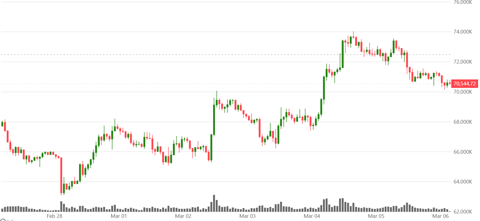 FX168財經報社(亞太)訊 週五(3月6日)比特幣在昨日升至一個月高點7.4萬美元后,進一步買盤動能開始減弱,目前回落至7.06萬美元附近,不過,從年初至今看,比特幣仍累計下跌近19%。目前伊朗戰爭並未結束,本交易日來看,市場還關注美國非農就業報告。