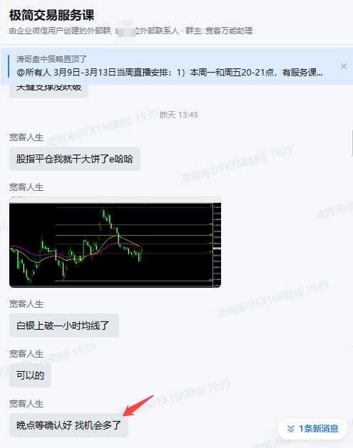 一波止盈不歇腳,機會緊隨其後。寬客老師緊盯盤面,及時捕捉到白銀出現明確做多信號,第一時間在羣內提示佈局機會。進入美盤時段後,白銀如期啓動,價格逐步拉昇、穩步走高,跟隨提示進場的學員再次抓住行情,收穫實實在在的盈利。一天之內,納指空單止盈 + 白銀多單拉昇,兩波機會連續兌現。