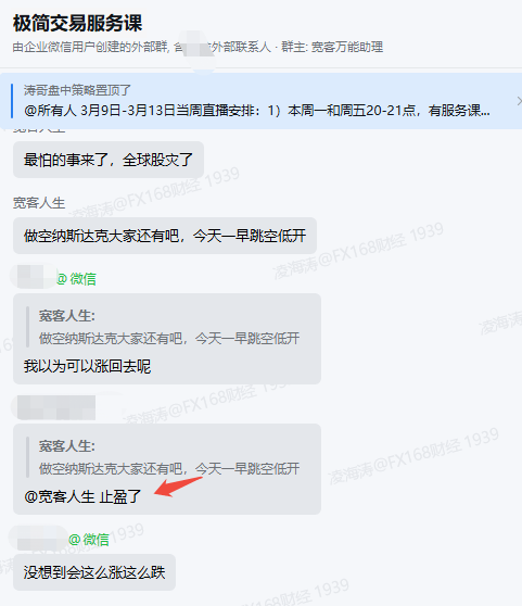 行情波動再快,也快不過專業的佈局;市場變化再亂,也亂不掉清晰的策略。3 月 9 日,《極簡交易方法論》服務羣再一次用實戰證明:跟對體系,盈利就是水到渠成。早在上週,寬客老師便在羣內精準研判,帶領學員佈局納斯達克指數空單。本週一開盤,納指直接跳空低開、一路低走,完全符合老師預判。羣內學員從容按計劃止盈離場,利潤穩穩落袋,開局就是開門紅。