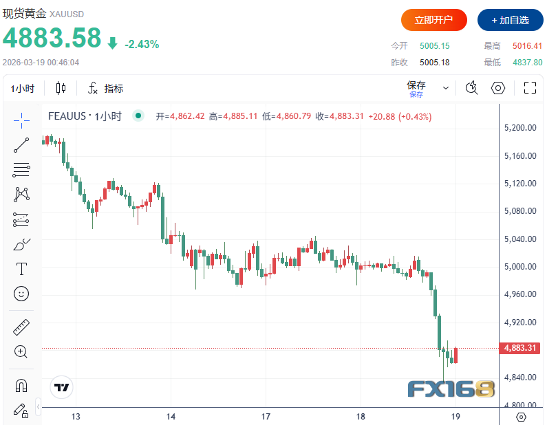 FX168財經報社(北美)訊 週三(3月18日),現貨黃金(XAU/USD)延續弱勢,在美元與美債收益率反彈的壓制下進一步下跌,盤中一度觸及2月6日以來最低水平4834.14美元/盎司,隨後在4880美元附近整理。市場焦點則轉向稍晚公佈的美聯儲利率決議。與此同時,美國2月生產者物價指數(PPI)意外強勁,加之中東戰火持續升級推高能源價格,令市場對「高利率維持更久」的押注再度升溫,黃金因此持續承壓。