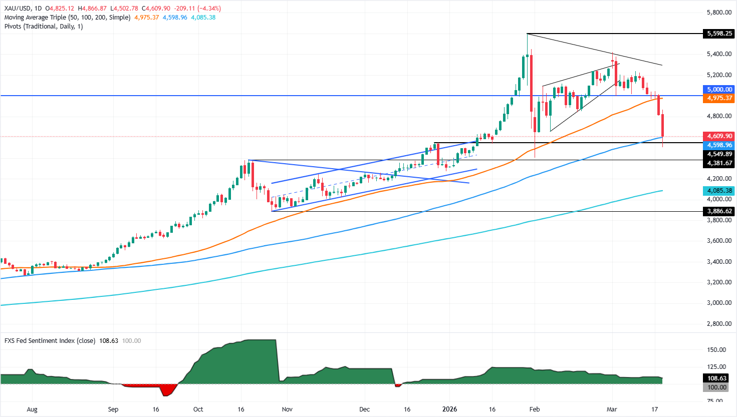 黃金技術面仍偏向上漲,100日簡單移動均線(SMA)位於4,577美元,作為關鍵支撐位,若被有效跌破,可能打開通向4,200美元的大門。