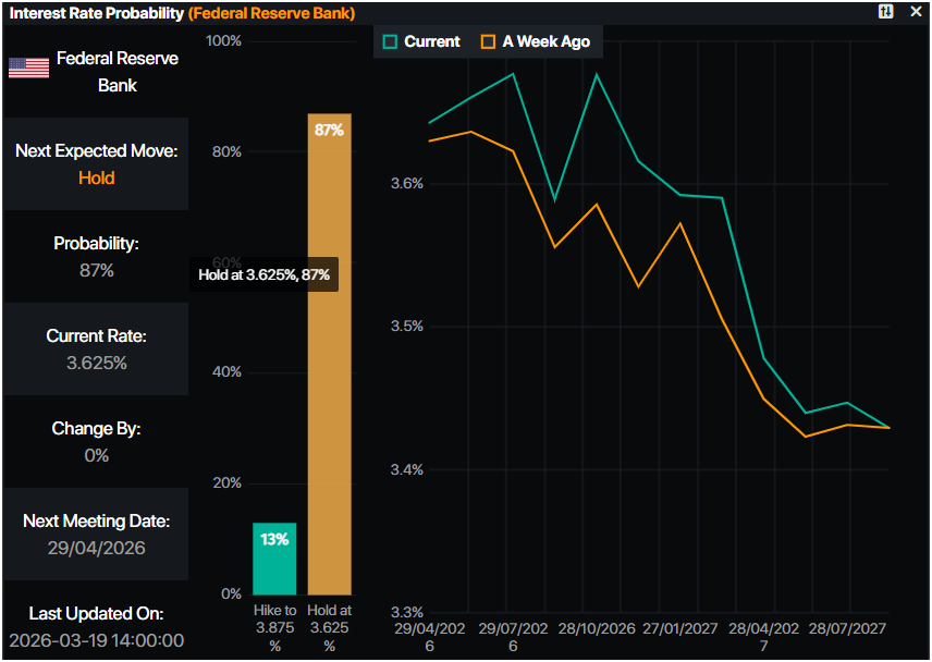 儘管SEP預測今年將有一次降息,但根據Prime Market Terminal數據,貨幣市場不預期2026年美聯儲降息,首次降息預計在2027年上半年。