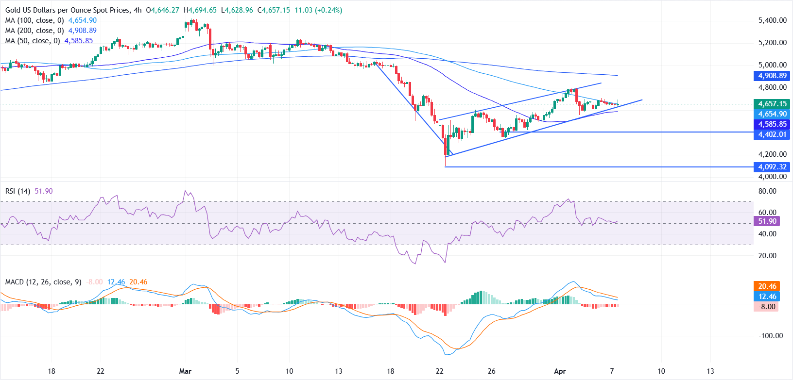 週二,黃金(黃金/美元)在震盪區間內交易,市場因美國總統唐納德·特朗普對伊朗達成協議的最後通牒臨近而緊張。截至發稿時,黃金/美元交投於4657美元附近,價格走勢缺乏明確方向,交易者正等待有關可能達成停火協議的消息,隨著截止日期的臨近,市場關注度提升。