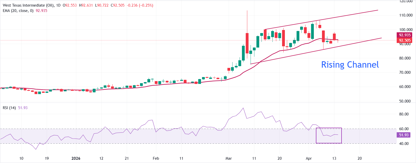 • WTI油價在日線圖上接近上升通道形態的下沿交易。