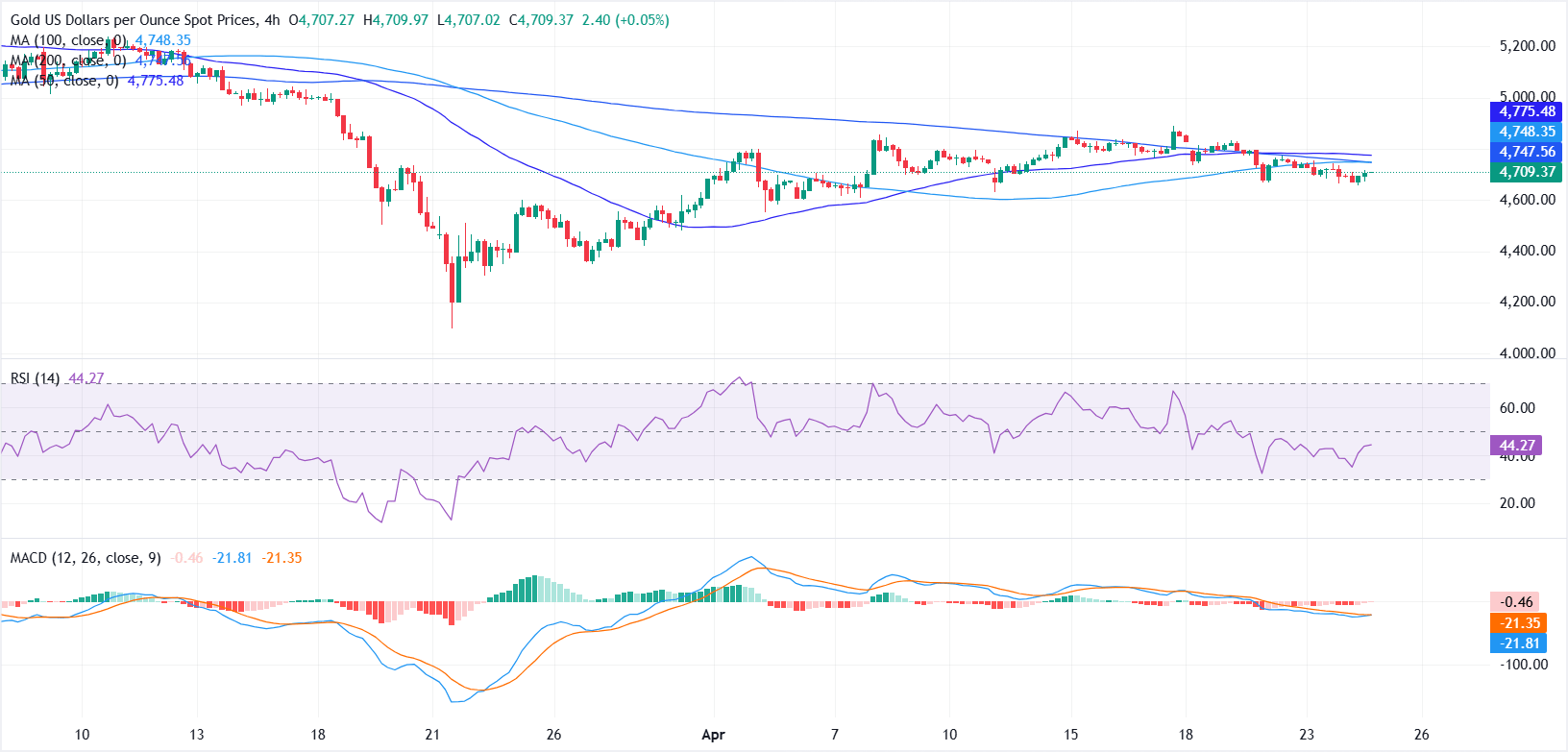 在4小時圖上,黃金/美元保持短期看跌偏向,持續交易於關鍵移動平均線下方。100週期簡單移動平均線(SMA)位於4748美元,200週期SMA位於4747美元,50週期SMA位於4775美元,三者形成緊密的阻力簇,進一步強化整體下行基調。