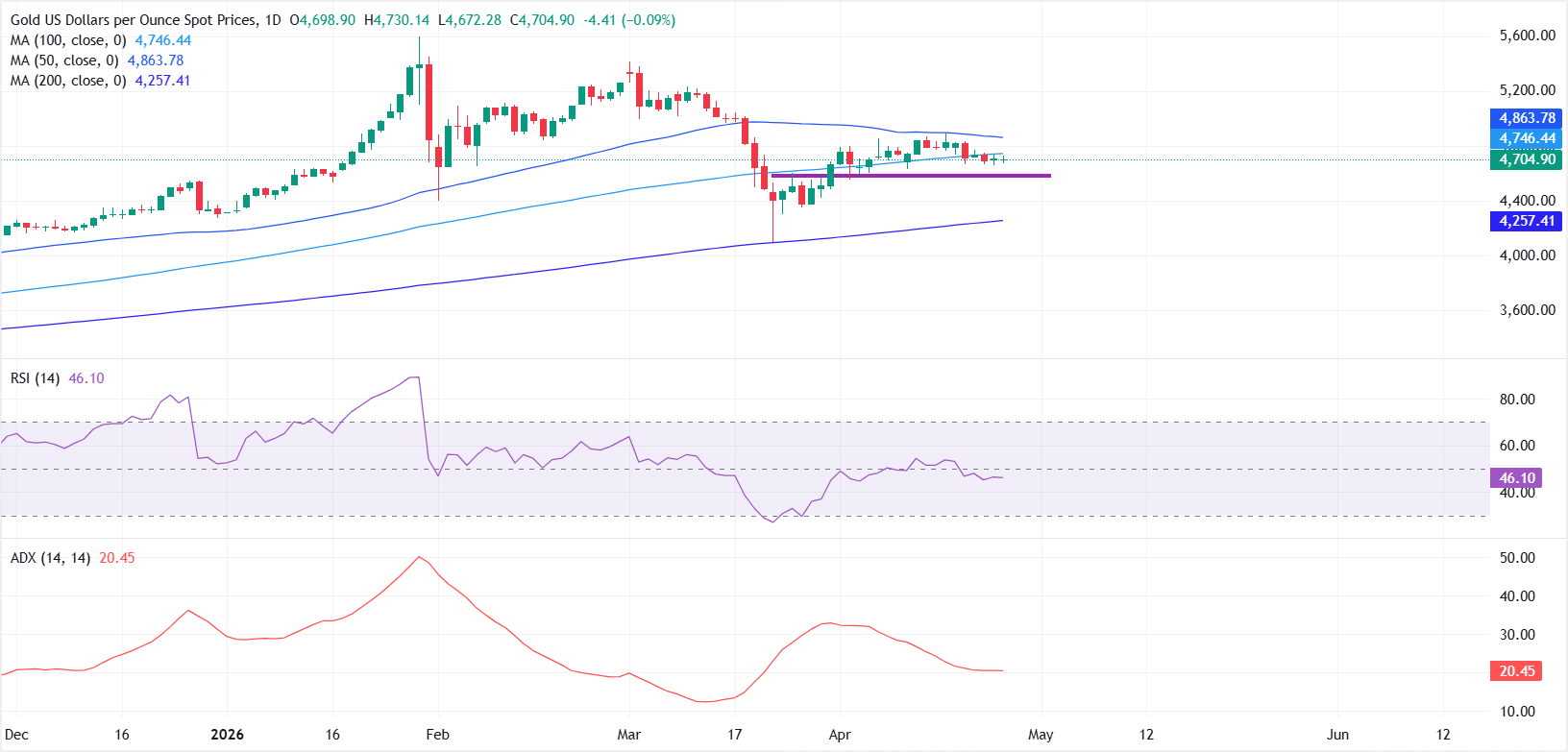 日線圖顯示,黃金/美元維持受限走勢,現貨價格保持在200日簡單移動均線(SMA)4257美元上方,但仍低於100日和50日SMA。