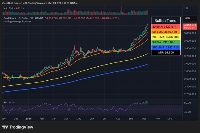 教育公司Coin Bureau的創始人Nic Puckrin表示,今年迄今爲止,黃金價格已上漲逾50%,加上高盛(Goldman Sachs)預測到2026年底將達到4900美元/盎司,這表明黃金交易「過熱」。