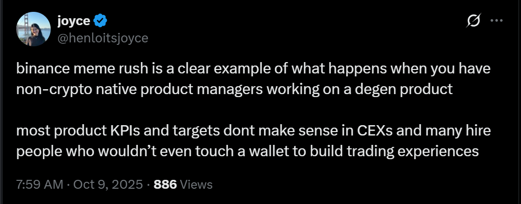 X平臺用戶henloitsjoyce認爲,像迷因幣發行平臺這樣的「degen」(高風險投機)產品並不符合中心化交易所的業績目標或關鍵指標。或許迷因幣成功的真正原因在於其缺乏監管與審查。儘管如此,交易者很可能提前拋售了現有BNB Chain迷因幣,準備遷移到新平臺。