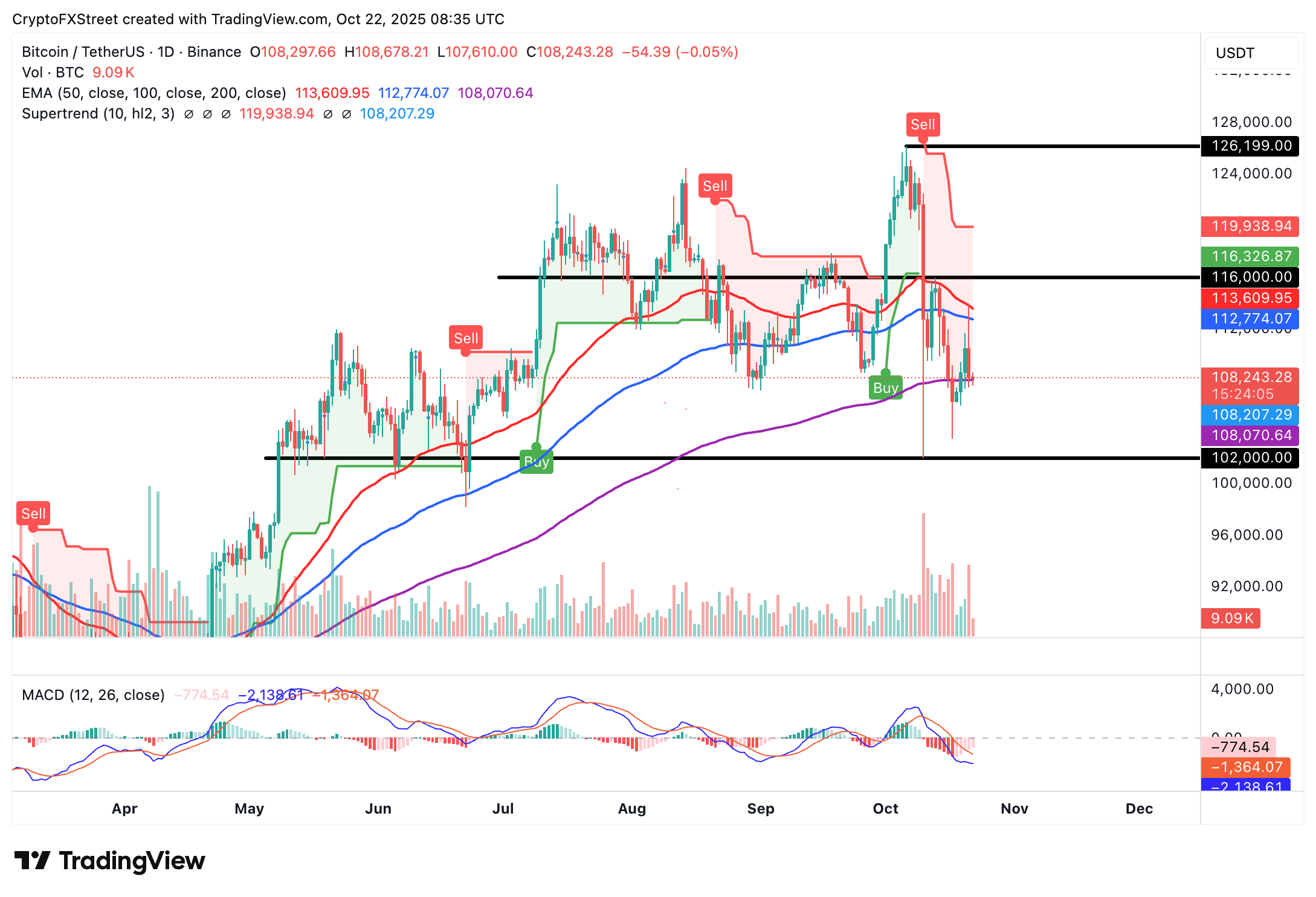 移動平均線趨同/背離(MACD)和超級趨勢指標突顯出看跌的技術結構,增加了向比特幣10月低點$102,000延續下跌的可能性。