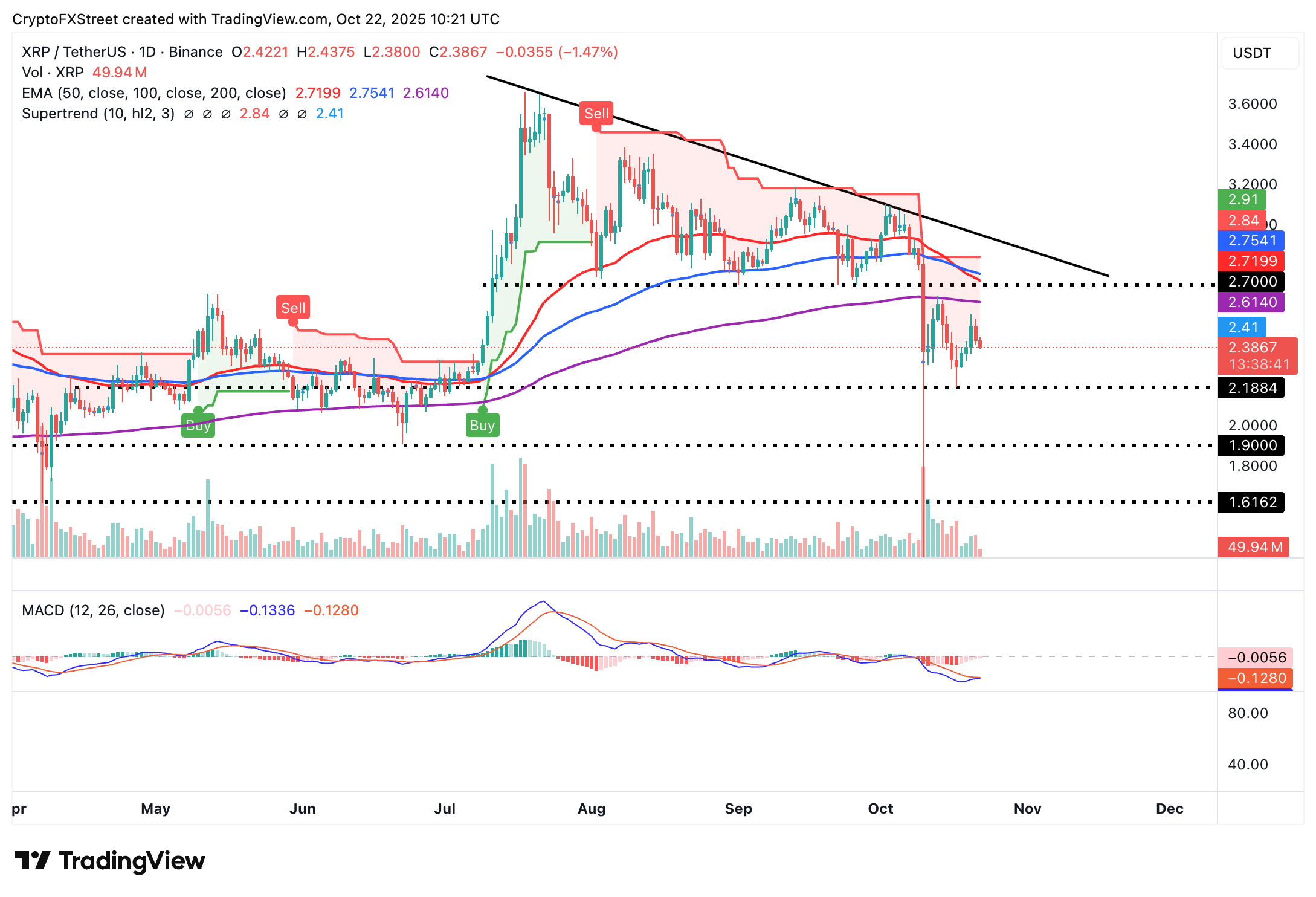 交易者應關注價格走勢,朝下個支撐位$2.18移動,這可能使空頭決心將XRP推向$1.90的下一個水平,正如6月時測試的那樣。MACD指標在日線圖上仍然看跌,投資者可能會繼續減少其敞口,因為賣壓加劇。