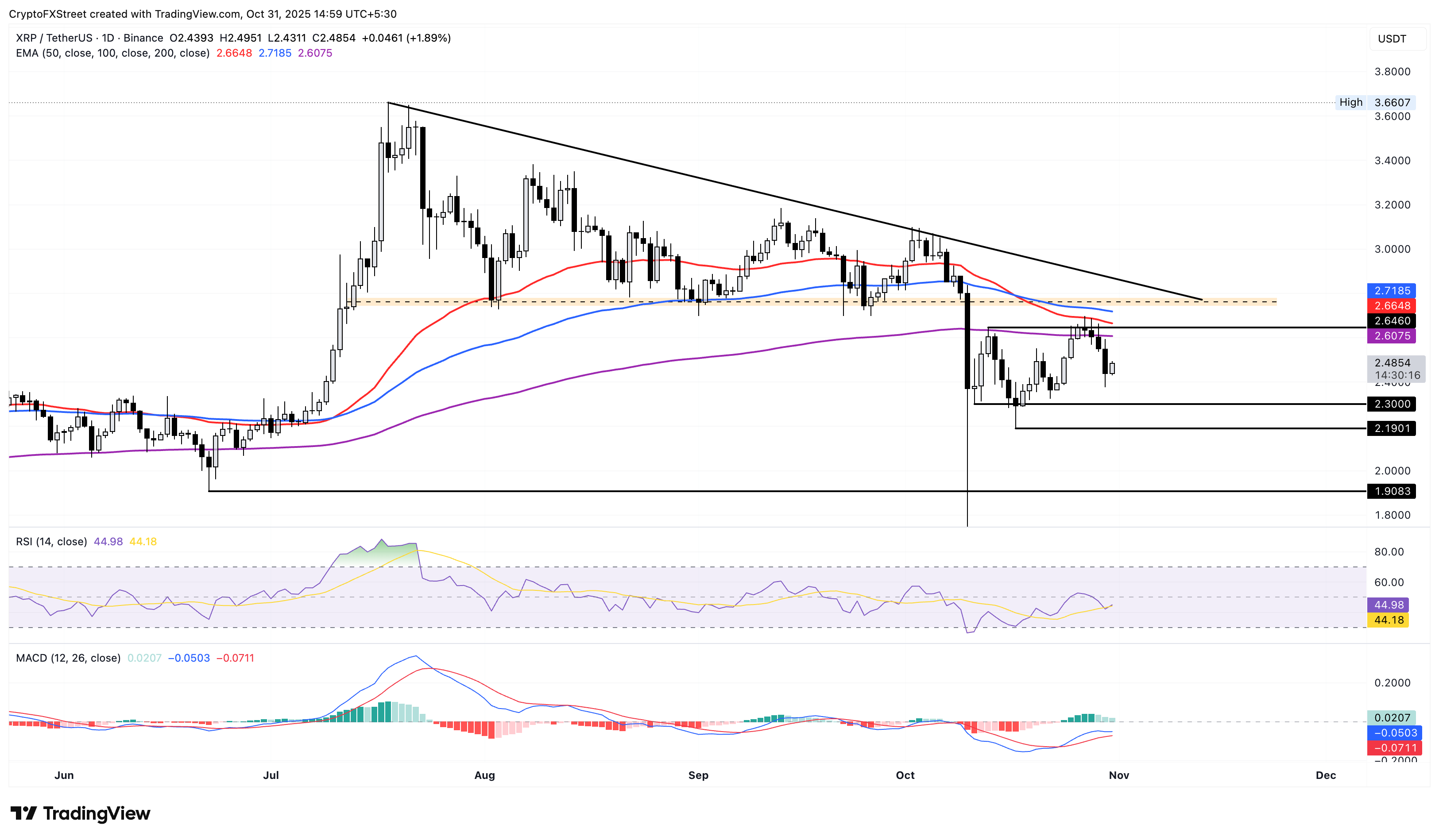 向下看,XRP的關鍵支撐位在2.30美元和2.19美元,分別由10月11日和10月17日的低點標記。