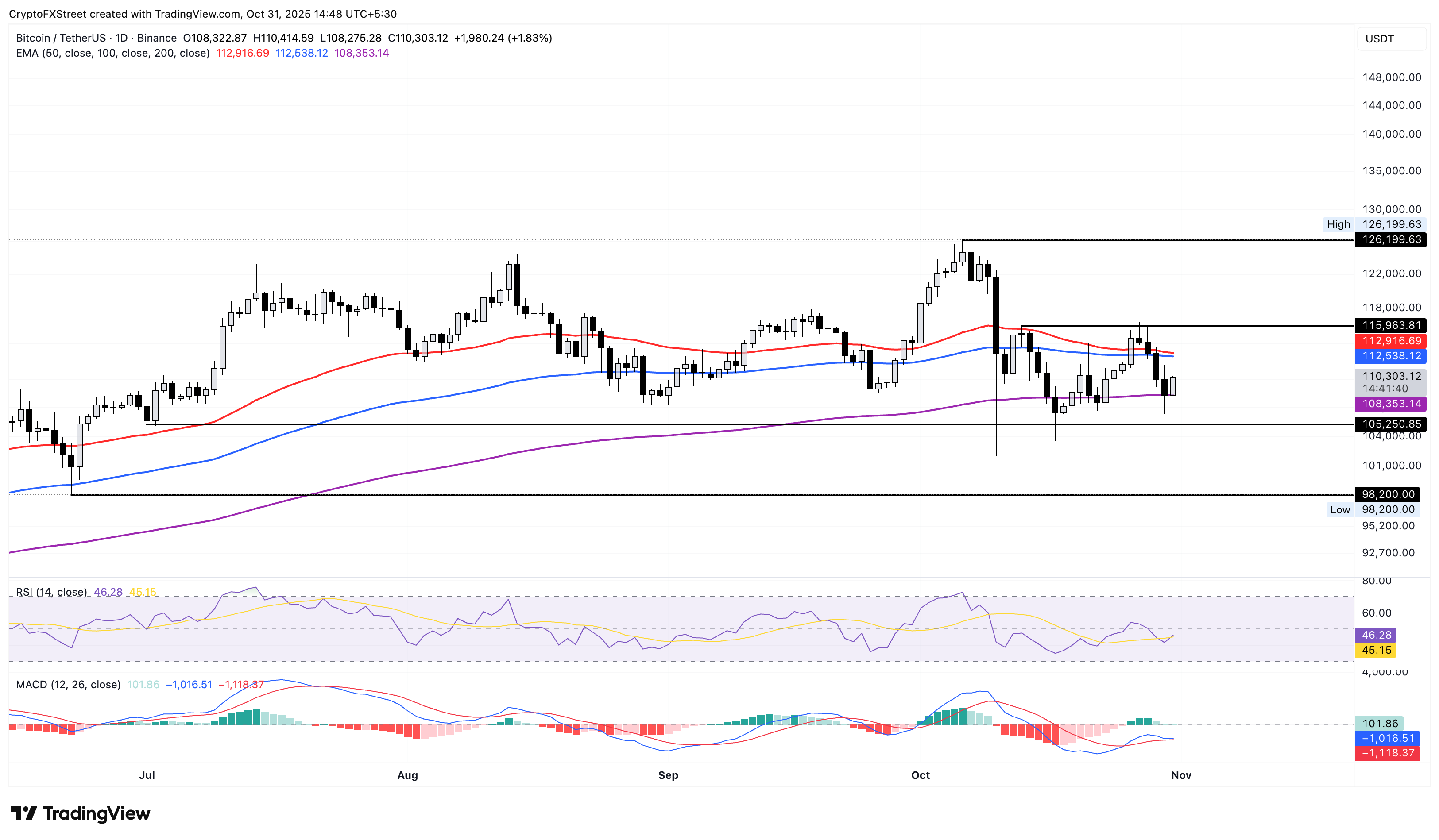 比特幣(BTC)和主要山寨幣在週五恢復,試圖在連續四天的下跌後找到支撐。BTC反彈至110,000美元以上,從200日指數移動平均線(EMA)反彈,而以太坊(ETH)和瑞波幣(XRP)則模仿比特幣的日內恢復,儘管美聯儲週三的降息和特朗普與習近平的會晤未能提振市場情緒。