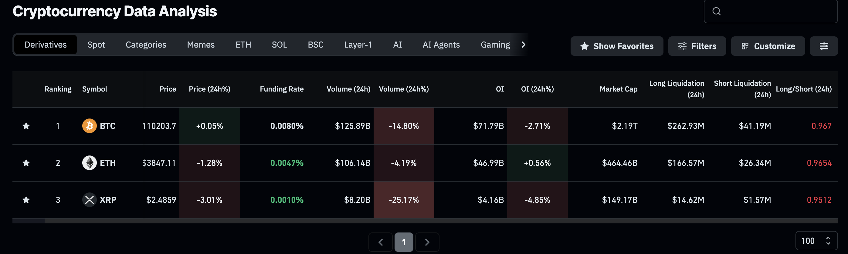 BTC、ETH和XRP衍生品數據。來源:CoinGlass