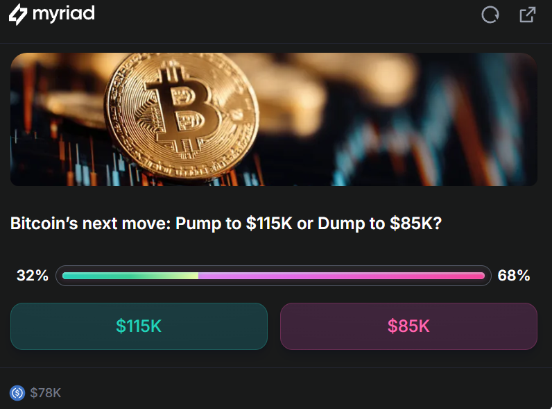 與此同時,在 Myriad —— 由 Decrypt 母公司 Dastan 打造的預測市場 —— 上,交易員正押注市場將繼續「殺跌」。多達 73.3% 的資金押比特幣跌向 85,000美元,而不是漲向 115,000美元。
