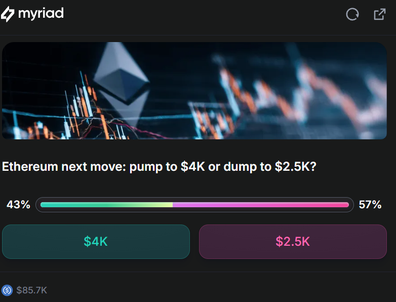 對於以太坊,Myriad 用戶認爲 ETH 下滑至 2,500美元 的概率爲 62%,高於漲到 4,000美元 的概率。目前 ETH 約爲 2,800美元。