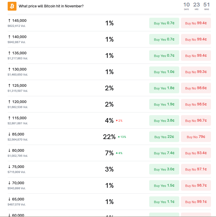 Polymarket 的交易員正在圍繞疲弱情緒佈局,認爲 BTC 更可能跌向 85,000美元,而上漲情景幾乎沒人押注。
