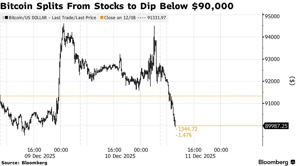 FX168財經報社(亞太)訊 週四(12月11日)進入亞市盤中,比特幣在美聯儲降息 25 個基點後繼續徘徊在90,000 美元附近。美聯儲承認圍繞美國經濟前景的高度不確定性,市場焦點轉向日本央行決議。