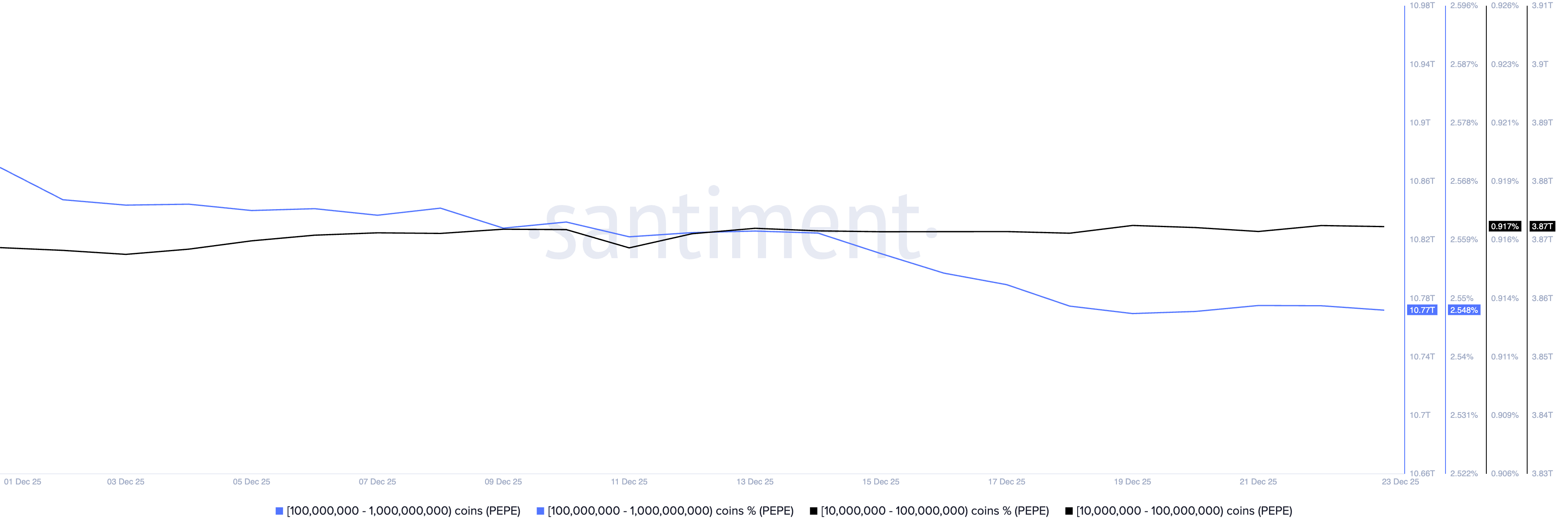 大額錢包投資者正在削減其PEPE持有量,增加了供應壓力,並暗示信心下降。Santiment數據顯示,持有1億到10億PEPE的投資者持有10.77萬億個代幣(占流通供應的2.54%),低於12月1日的10.87萬億PEPE(占流通供應的2.57%)。