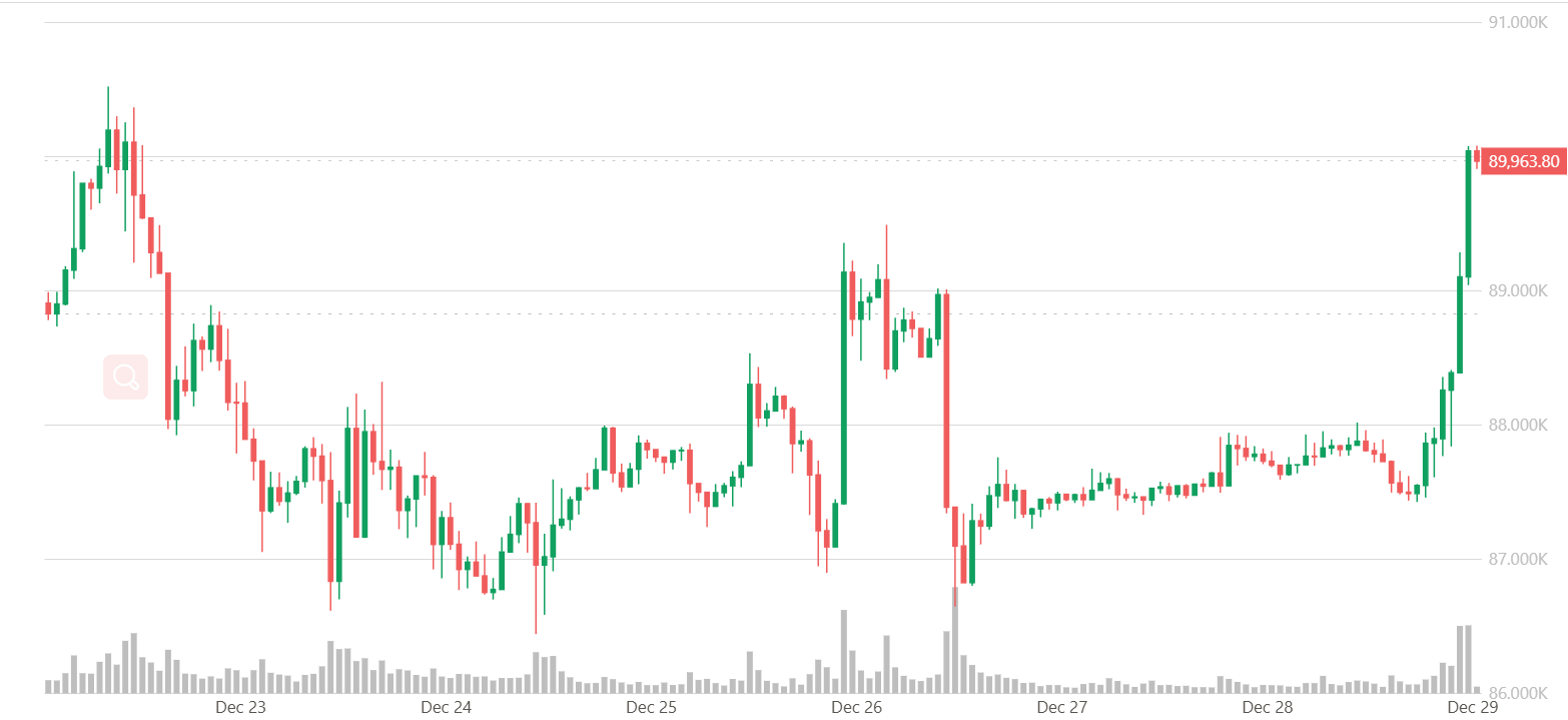 FX168財經報社(亞太)訊 週一(12月29日)亞洲交易時段,比特幣加速突破一度觸及9萬美元大關,與此同時,黃金與白銀刷新高點,凸顯年末避險需求升溫。在「聖誕老人行情」的時間窗口仍未關閉的背景下,投資者正關注1月初是否會出現新增資金流入,從而帶動加密市場反彈。