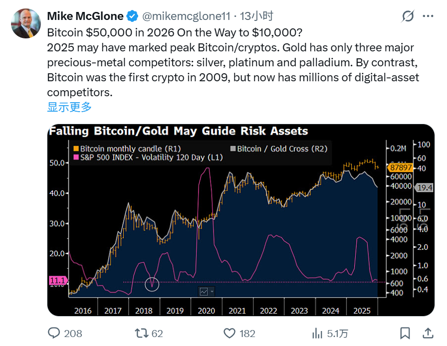McGlone解釋稱,1萬美元大致對應比特幣在2020年後投機狂潮之前的交易水平。他可能認爲,自那之後的價格上漲,在很大程度上是由「過剩流動性」推動的。若回落至1萬美元,意味着市場將回到更「正常」的估值水平,完成一次所謂的「迴歸常態」。
