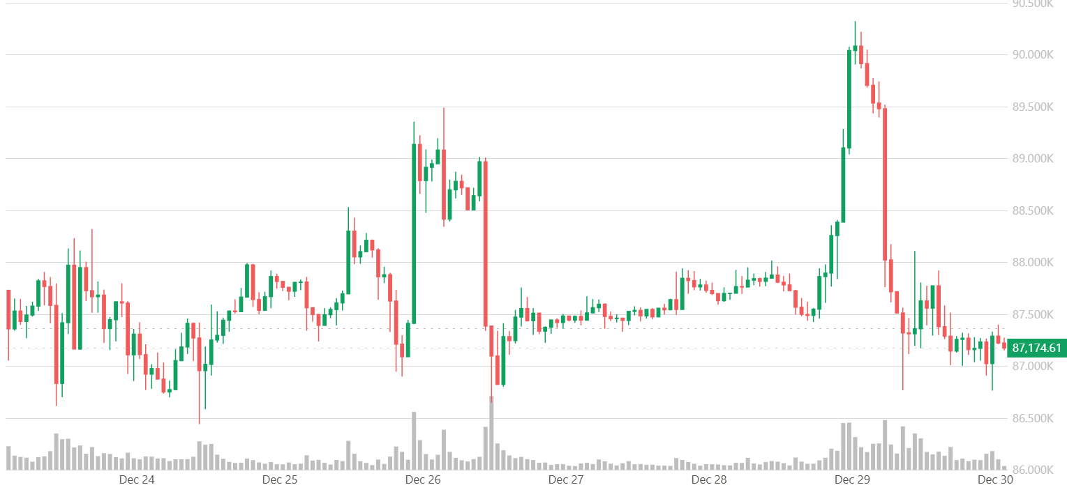 FX168財經報社(亞太)訊 週二(12月30日)進入亞市,比特幣繼續在8.73萬美元附近窄幅震盪,昨日衝擊9萬大關失敗。分析認爲,9萬美元這一心理關口已成爲短期交易的重要參考點,其得失對市場情緒具有顯著影響。