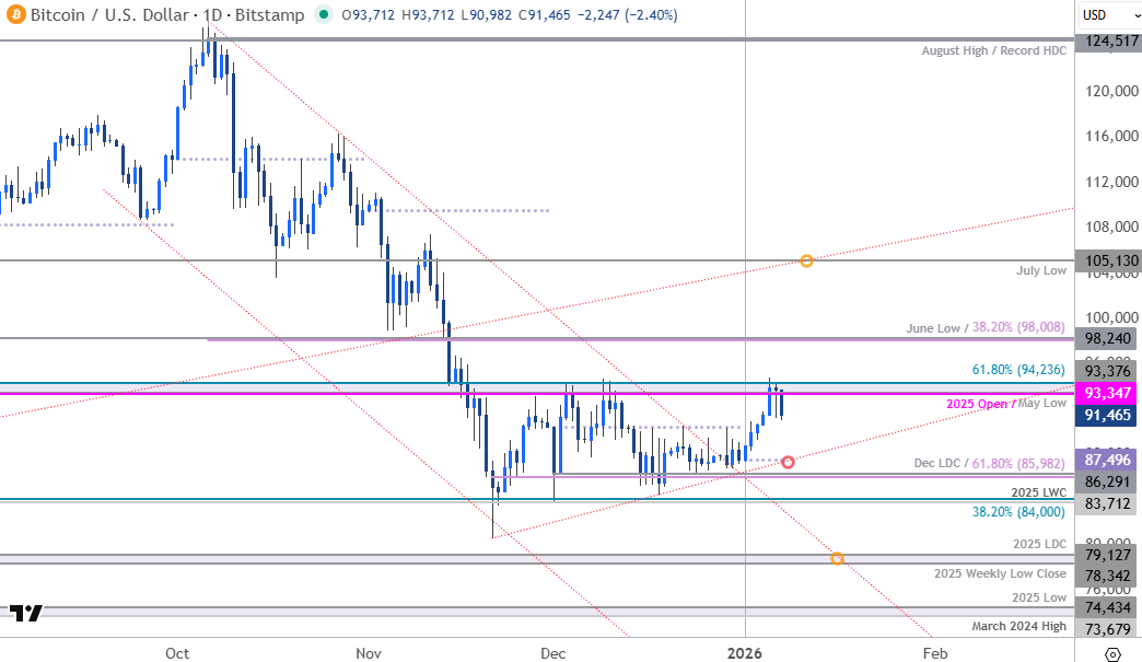 事實上,比特幣在12月開盤區間仍完整的情況下,正運行在關鍵技術阻力下方——關注突破方向以提供指引。從交易角度看,如果這一階段價格仍偏向下行,那麼反彈應被限制在94,236附近。