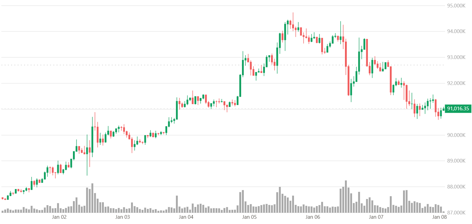FX168財經報社(亞太)訊 週四(1月8日)進入亞市,比特幣在昨日重挫後試圖守住9.1萬美元關口,分析人士認爲,本輪虛擬資產市場回調屬於短期快速上漲後的修正。今年以來虛擬資產整體價格在短時間內大幅攀升,引發大量獲利了結賣盤涌入,帶動市場轉爲下行。