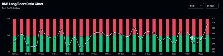 CoinGlass的數據表明,週二BNB在交易所的期貨未平倉合約(OI)激增至15億美元,較12月31日的13億美元上升,為12月初以來的最高水平。未平倉合約的增加表明新資金或額外資金進入市場並增加購買,這可能推動BNB價格的突破。