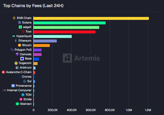 根據Artemis Terminal的數據,BNB鏈的24小時鏈費收入為120萬美元,位居Solana和edgeX等其他網絡之上,表明交易者的興趣和BNB鏈上的流動性正在增長。