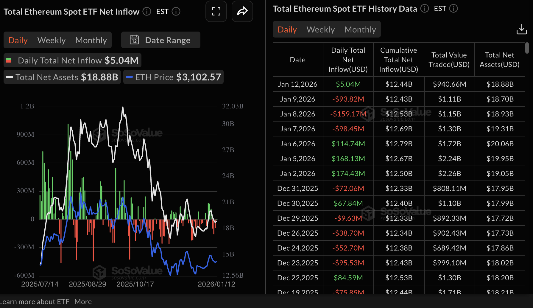 在美國上市的以太坊現貨ETF在週一錄得約500萬美元的溫和資金流入,此前連續三天出現資金外流。Grayscale的ETHE成為表現最佳的ETF,資金流入接近5100萬美元。根據SoSoValue的數據,累計資金流入量為124.4億美元,淨資產為188.8億美元。