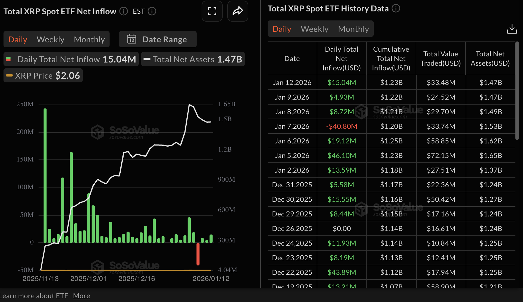 與此同時,XRP現貨ETF在週一吸引了1500萬美元的資金流入,連續第三天延續資金流入勢頭。Bitwise的XRP ETF以近800萬美元的資金流入領先,其次是富蘭克林邓普頓的XRPZ,約為450萬美元。週一五個XRP ETF均未錄得資金外流,累計資金流入達到12.3億美元,淨資產為14.7億美元。